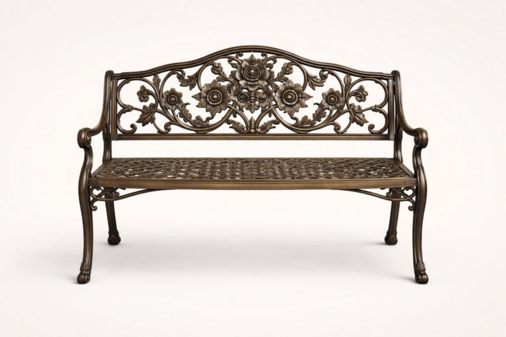 Outdoor Cast Aluminum Bench Floral Design with Armrests Brown